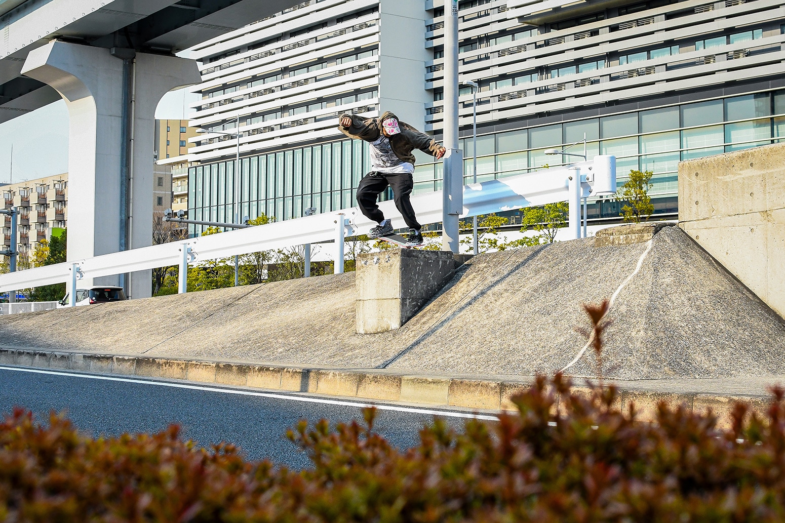 Yiyo Obando, Caroline Duerr, JJ Colon, Brandon Bonner, Richie Loffler y Leo Heinert patinando los spots de Chiyoda y Ariake antes de una misión en un spot secreto a lo largo del río.